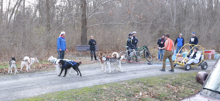 While waiting for gifts to be received, we had one of the oddest appearances evar. Now, we in the cycling world are used to man-trains and (wo)man-trains, but this was the first dog-train we'd evar seen in person: